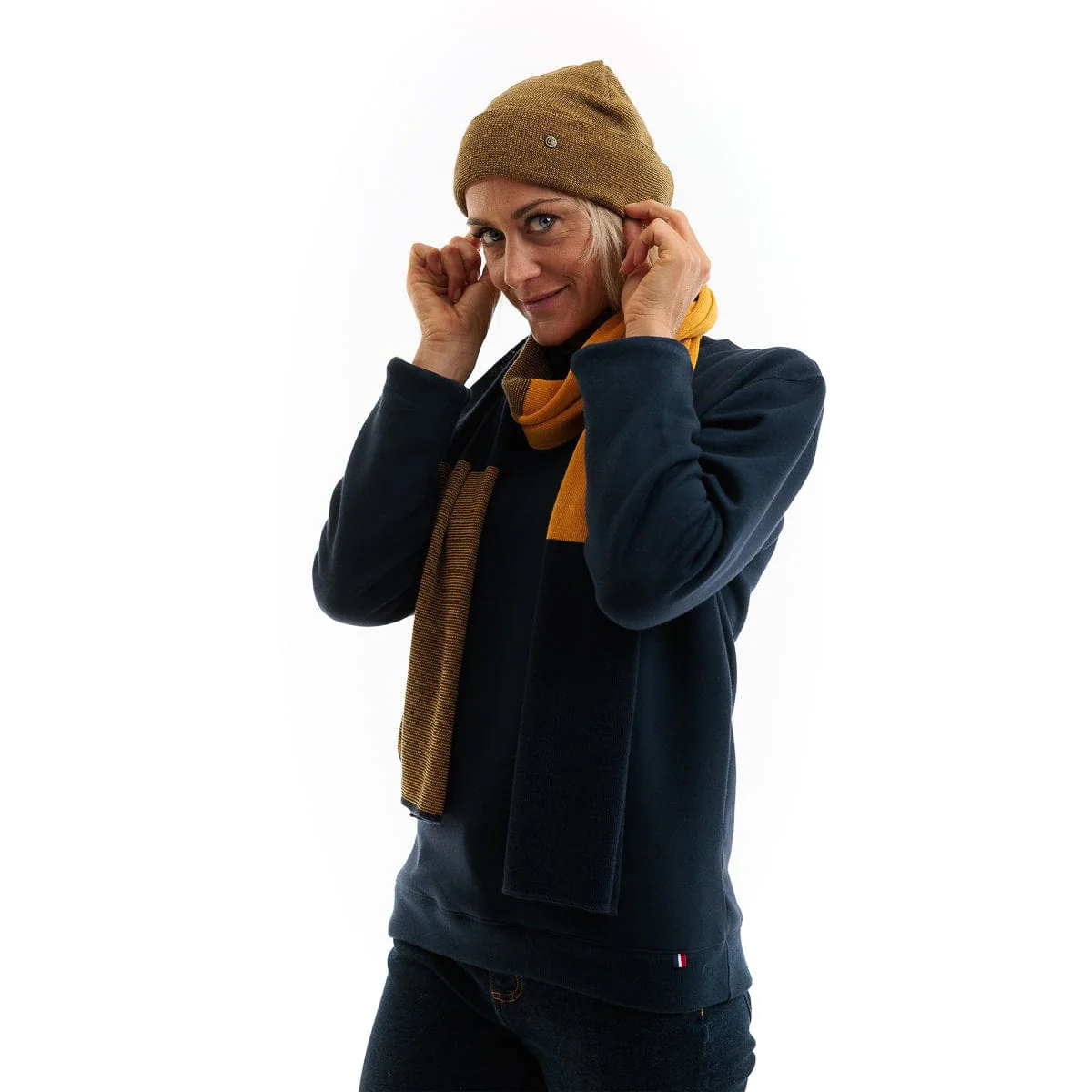 Le jaune tournesol illumine le teint et apporte une touche de pep's, subtilement équilibrée par un bleu marine chic et un brun-moutarde chaleureux. Ce mariage de couleurs s'accorde aussi bien avec un look urbain qu'avec une tenue plus décontractée.